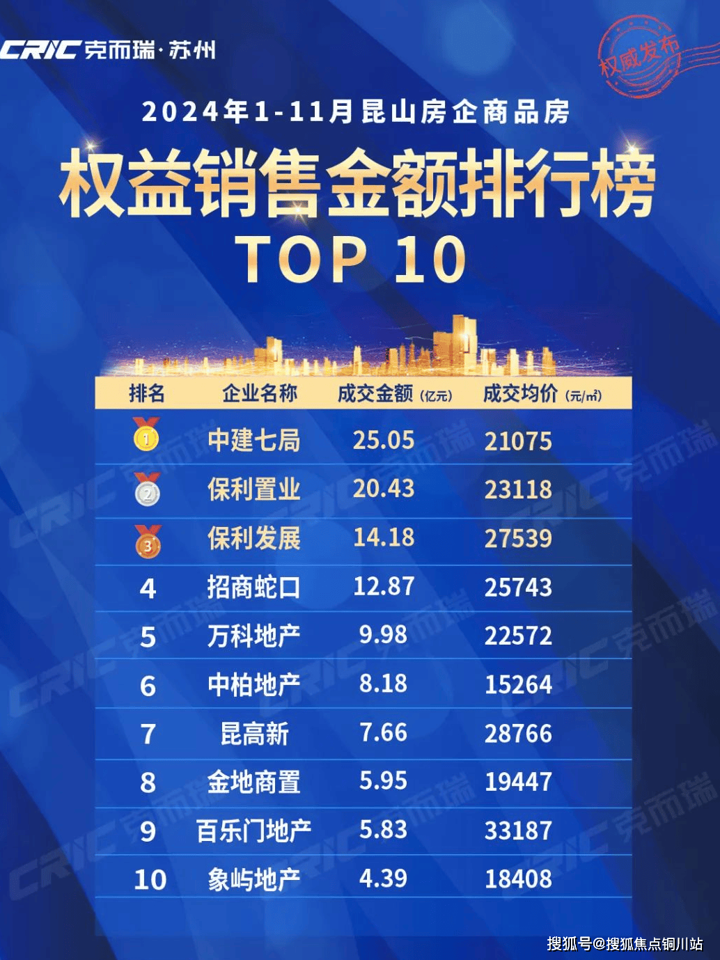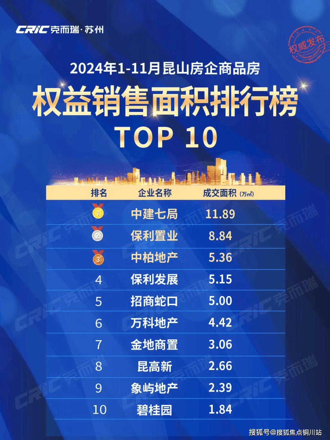 在今年的销售榜单中,中建七局地产集团以25.05亿元、11.89万方的优异成绩,摘得2024年1-11月昆山权益销售金额榜、面积榜双冠王,稳居昆山改善的第一梯队。(数据来源:克而瑞)