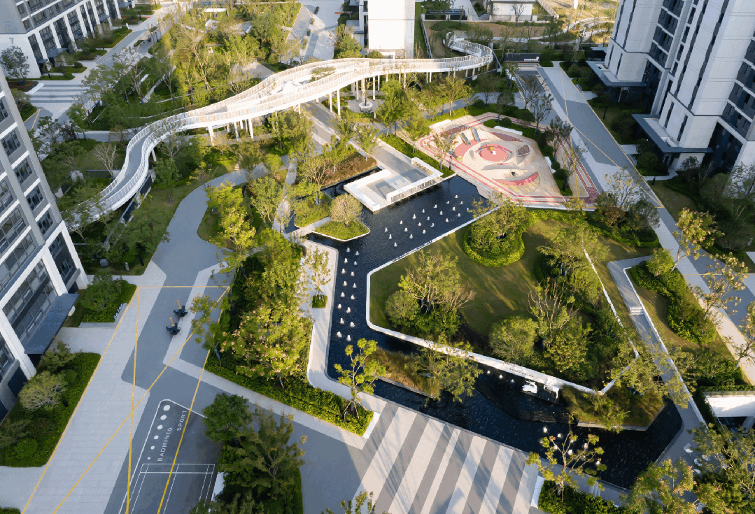 枝干婀娜的乌桕、圆满宽广的丛朴、郁郁青青的草坪...社区内大量绿色珍植,清澈水流潺潺而下,形成郁郁葱葱、层次丰富的景观。