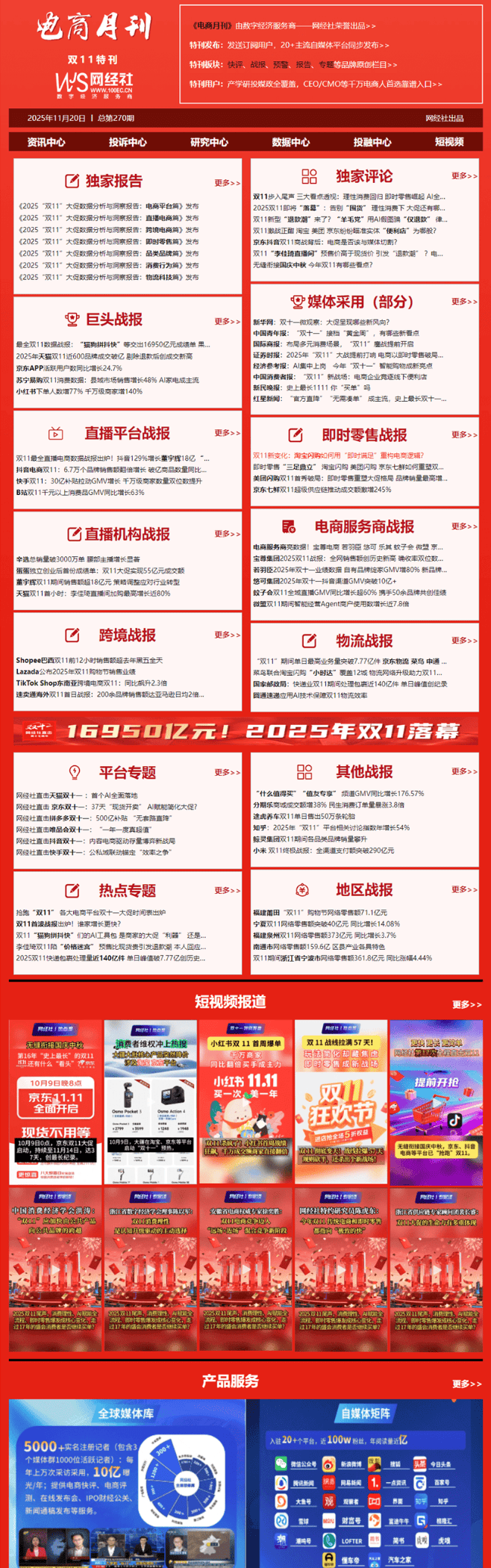 11月,网经社连续17次“直击双十一”特别策划告一段落,网经社电子商务研究中心发布7份《2025“双11”大促数据分析与洞察报告》系列报告,涵盖跨境电商、直播电商、电商平台、品牌品类、消费行为等多视角,系统梳理本届大促的发展现状、生态体系与未来趋势。